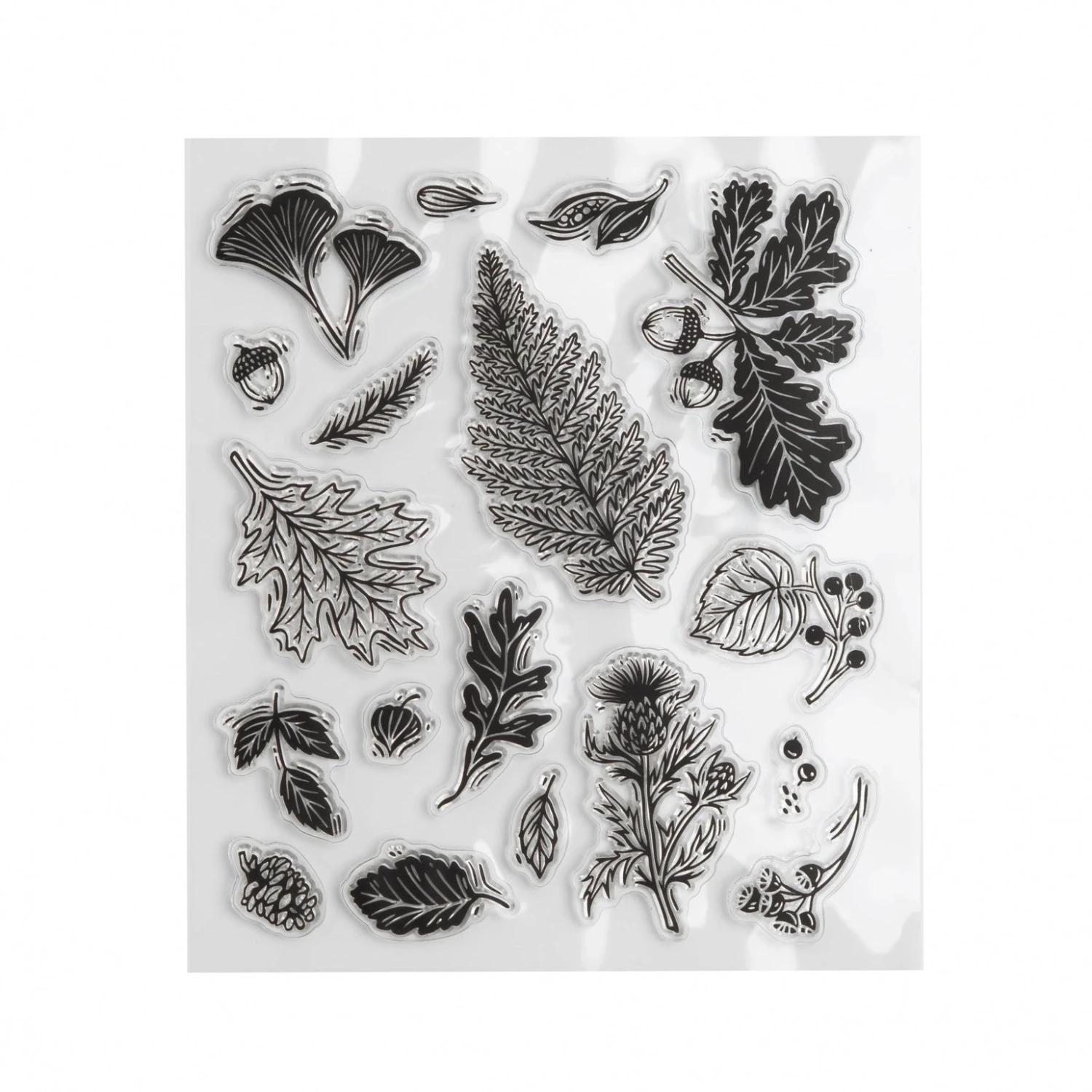 An 18-piece clear acrylic stamp set featuring hand-illustrated leaves, berries, seed pods, and botanical elements. Ideal for autumn-themed journaling, cardmaking, and seasonal spreads.
