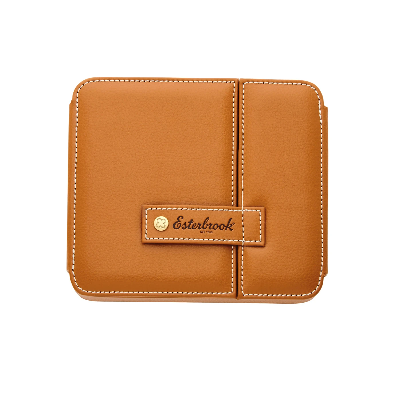We’ve paired grained British Tan leatherette with contrast white stitching, gold hardware, our logo Esterbrook Eternity snap and lined the interior with our Esterbrook Eternity symbol in brown and orange.
