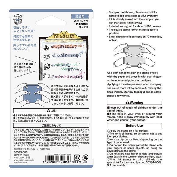 Stamp lightly for crisp impressions. Unlike the traditional rubber stamp where you need to press the stamp down and hold, pre-inked stamp works best with stamping lightly, do a quick press and release to prevent the ink overflow.
